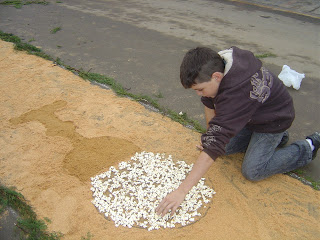 Catequistas catequisandos se empenharam na decoração do tapete, com motivos religiosos e mensagens de paz.